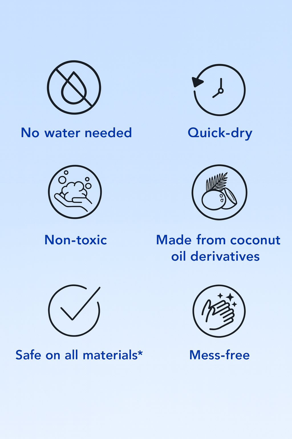 Our premium cleaning solution breaks down dirt, stains, and grime at the source without harming delicate materials or fading colors.